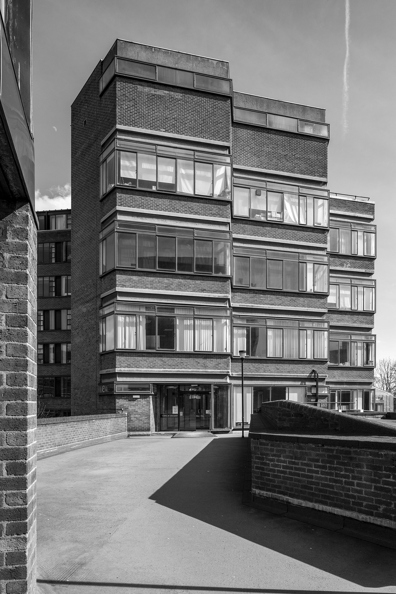 The University of Birmingham underwent a major expansion in the 1960s due to the production of a masterplan by Casson, Conder and Partners of which the School of Education was part. In 1968, the Casson, Conder and Partners-designed Institute for Education was opened. The complex consisted of a group of buildings centred around an eight-storey block, containing study offices, laboratories and teaching rooms. The building has a reinforced concrete frame which is exposed internally and the external walls are of silver-grey rustic bricks. The roofs of the lecture halls, penthouse and Child Study wing are covered in copper.
