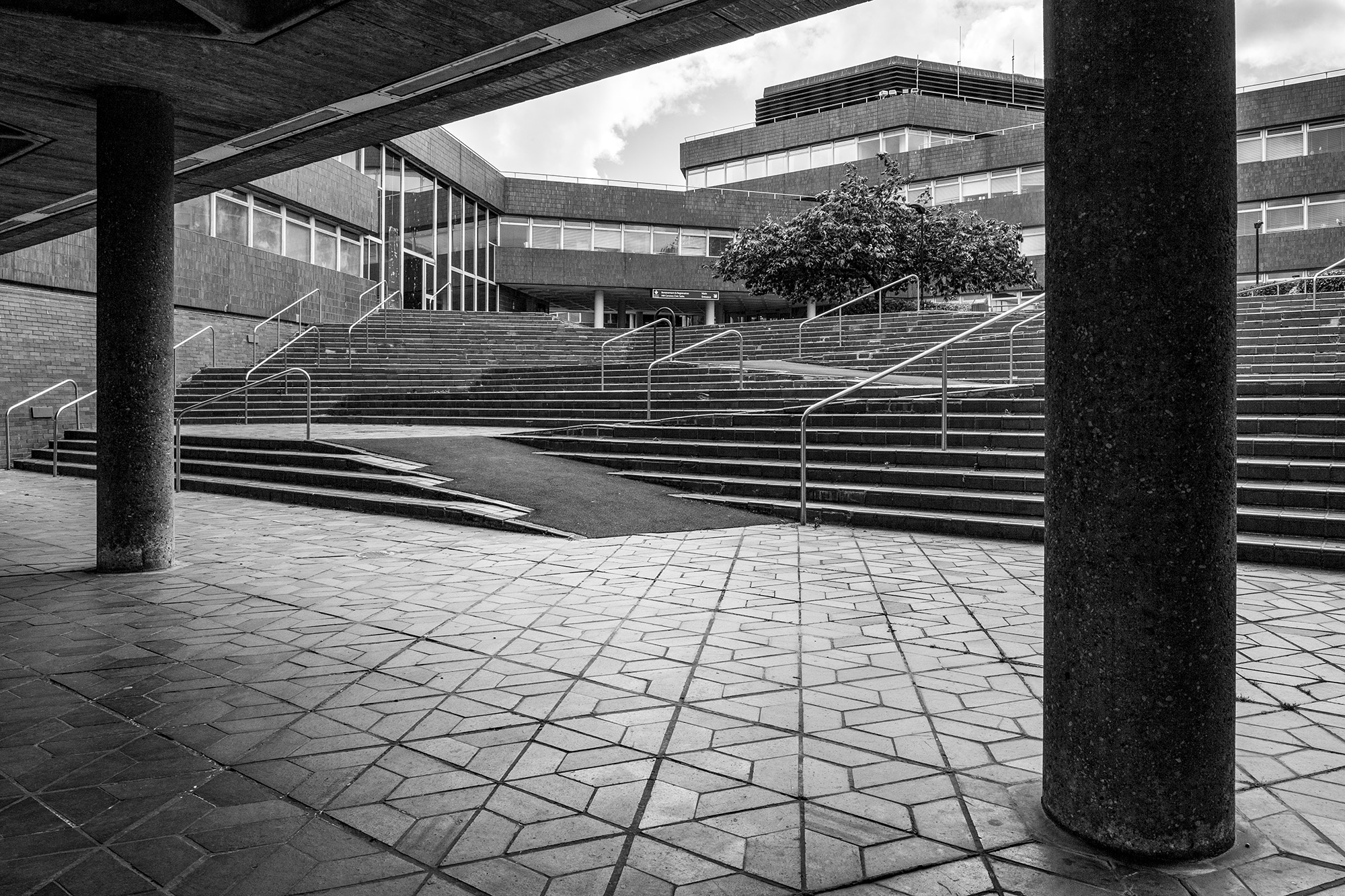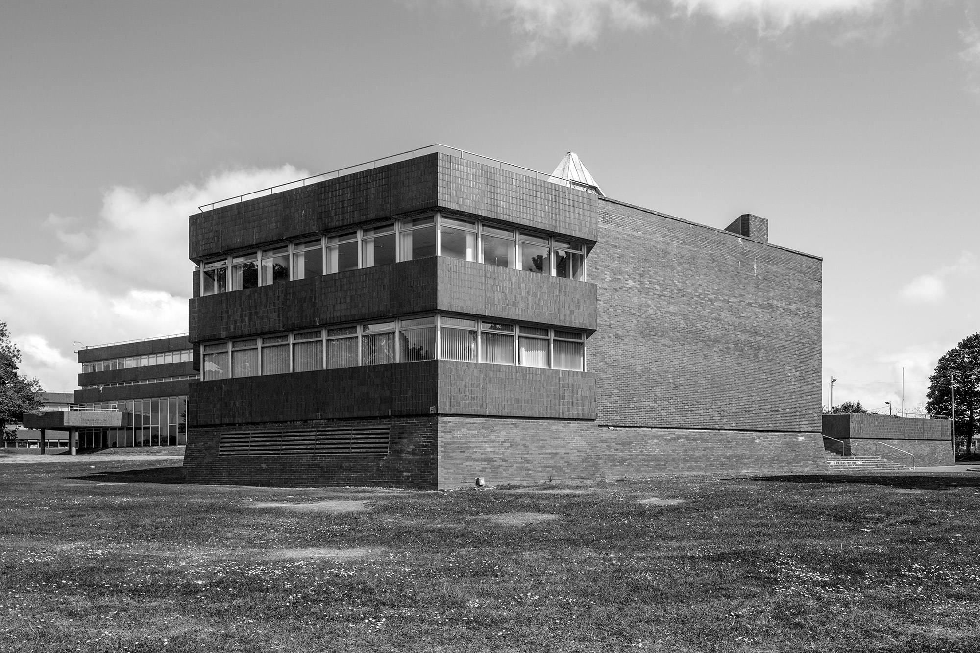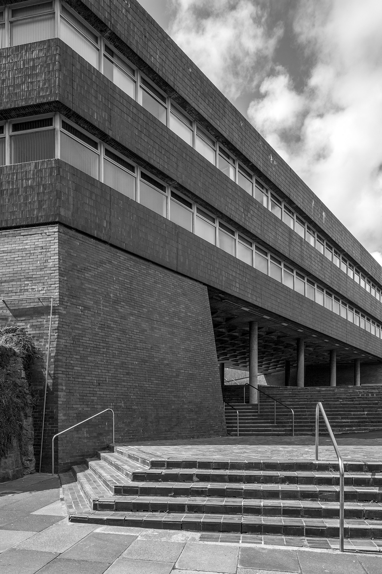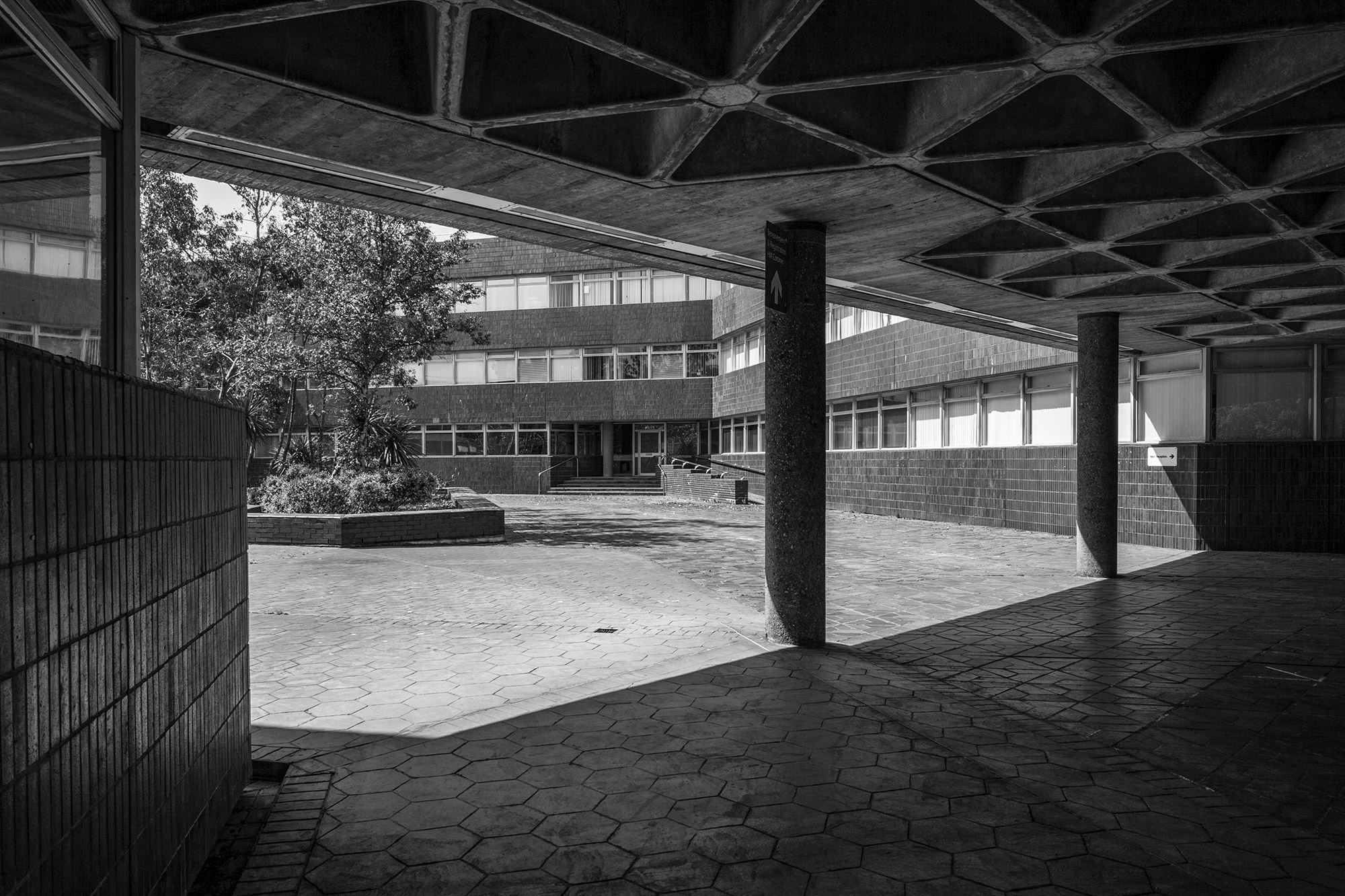 Designed by John S Bonnington of Sir Basil Spence, Bonnington and Collins to fit on a sloping site, Sunderland Civic Centre is approached via a carefully arranged series of steps and ramps creating its own urban landscape. On plan, the building is comprised of two low-rise hexagonal blocks with inner courtyards, an administrative block to the south, and a connected car park to the north. All structures are faced externally in brindled brick and red tile giving cohesiveness to the whole. Internally, bespoke fitting and fixtures were designed by Bonnington, some adopting the hexagon as a motif.