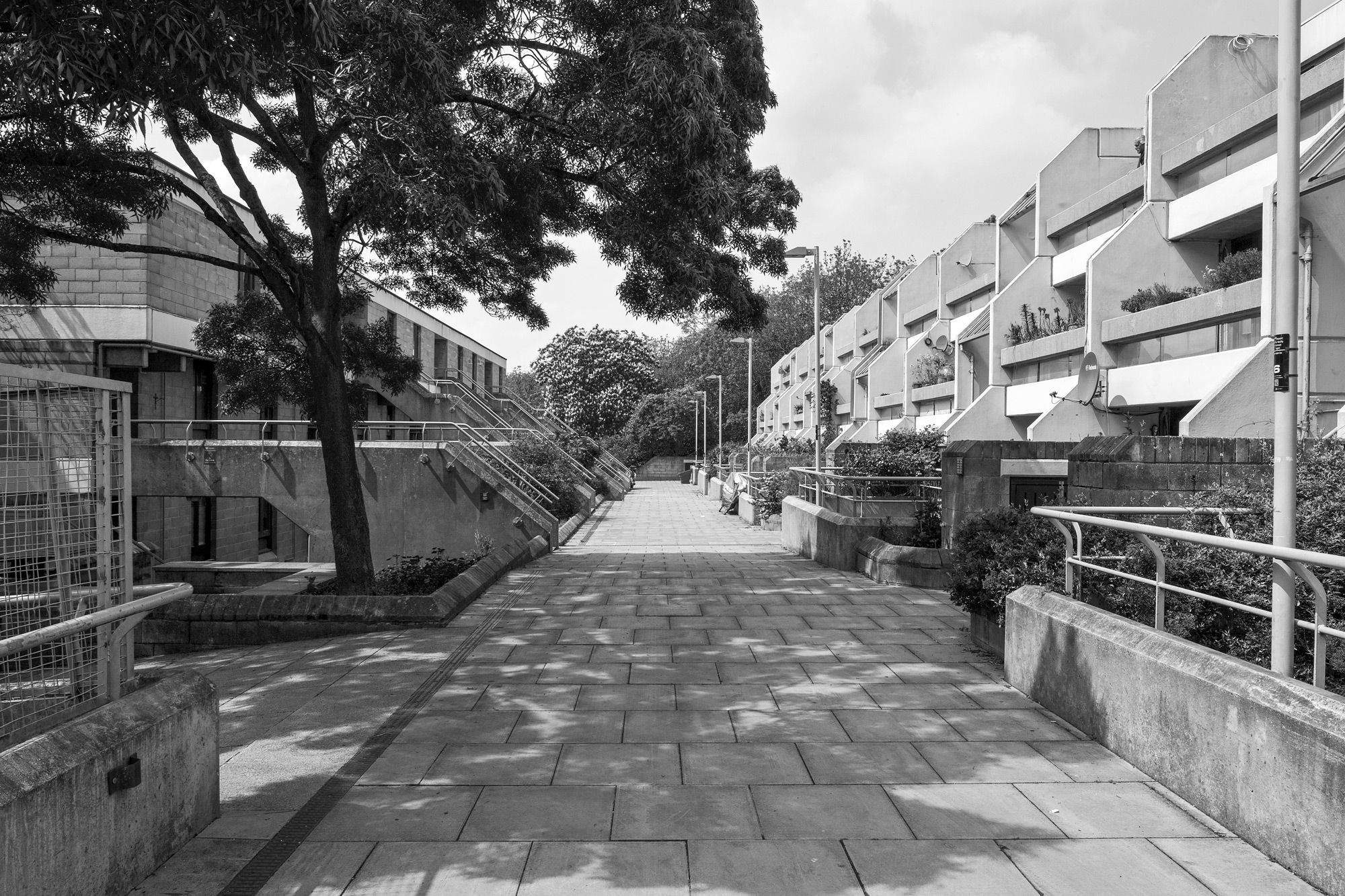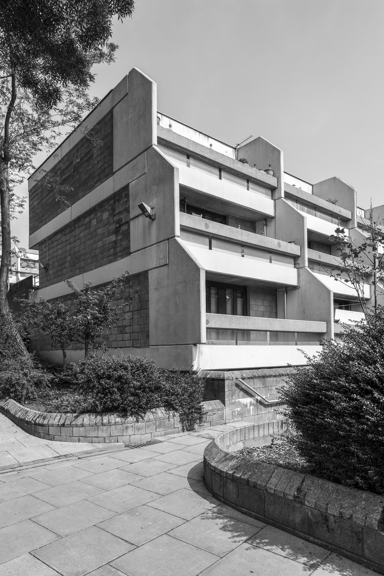 Borough Architect Sydney Cook had been impressed by Peter Tábori, a young Hungarian architect, and designs made as part of his student diploma scheme were ultimately commissioned by Cook and became the Whittington Estate. It consists of six terraces articulated by strongly horizontal balconies and punctuated by the verticals of the stair access. Between the stepped terraces on the sloping site are walkways and tranquil green spaces with existing trees and informal, unregimented planting that soften the hard geometries of the architecture.