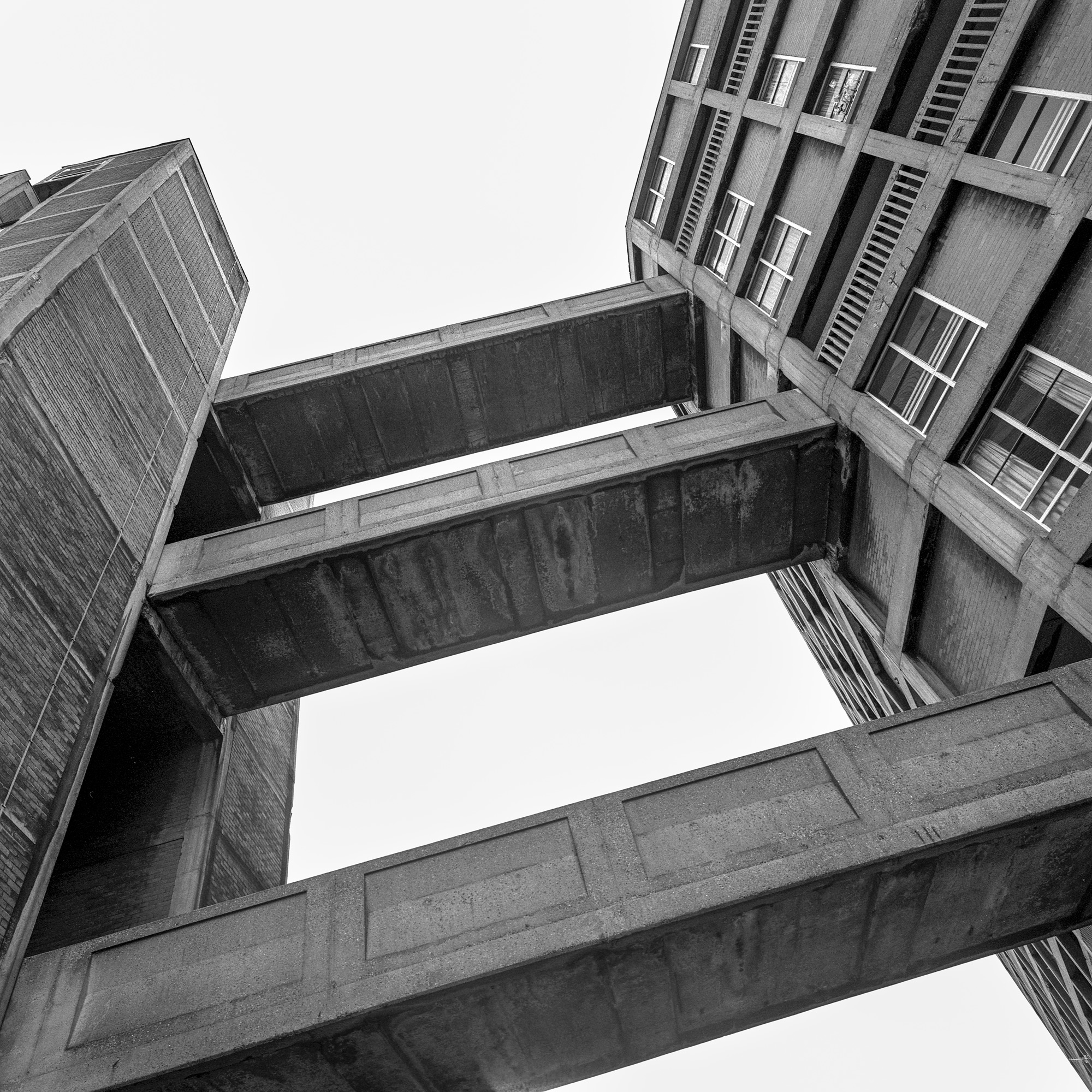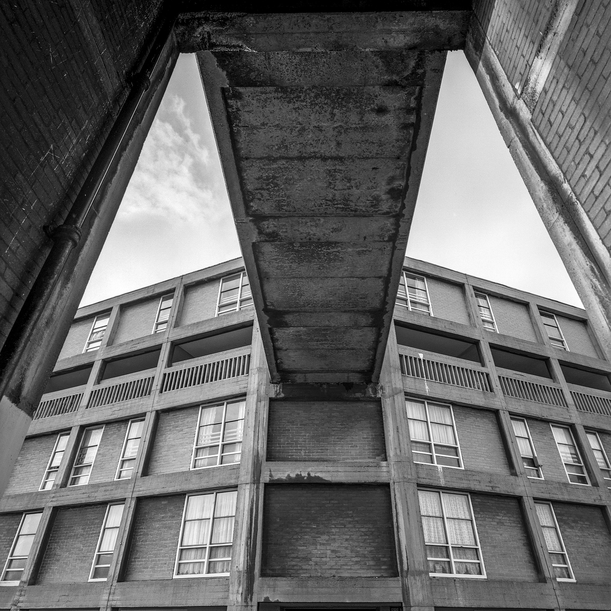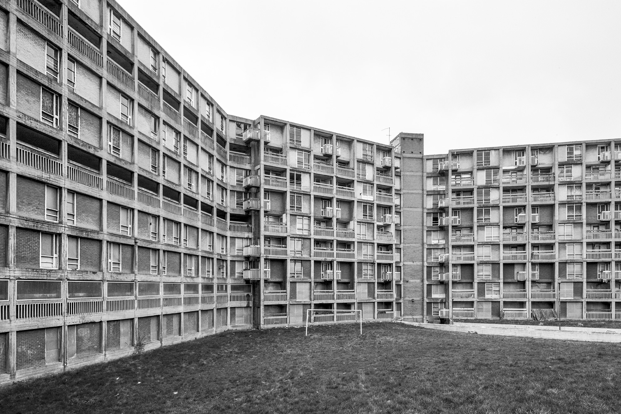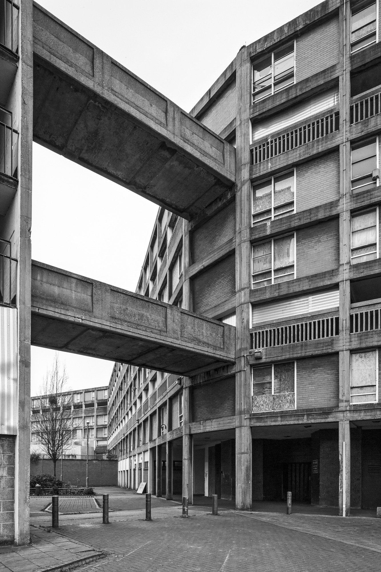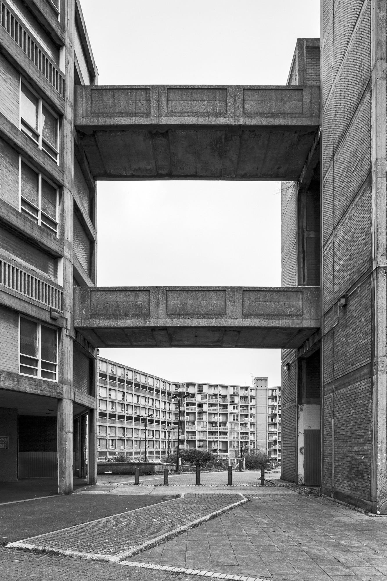 Flats and maisonettes. 1957-60 by Sheffield Corporation City Architect’s Department under J L Womersley, designed by Jack Lynn and Ivor Smith with F E Nicklin and John Forrester (artist); Ronald Jenkins of Ove Arup and Partners, engineer. Formally opened in 1961 by Hugh Gaitskell. Reinforced concrete frame, partly board marked, with concrete balcony fronts and brick infill in four shades – a progression of purple, terracotta, light red and cream. Continuous flat roof of even height throughout the estate. The deck system was uniquely appropriate here because the steeply sloping site allowed all but the uppermost deck to reach ground level, and the impact of the long, flat-topped structure rising above the city centre makes for one of Sheffield’s most impressive landmarks. The result was Britain’s first completed scheme of post-war slum clearance and the most ambitious inner-city development of its time.