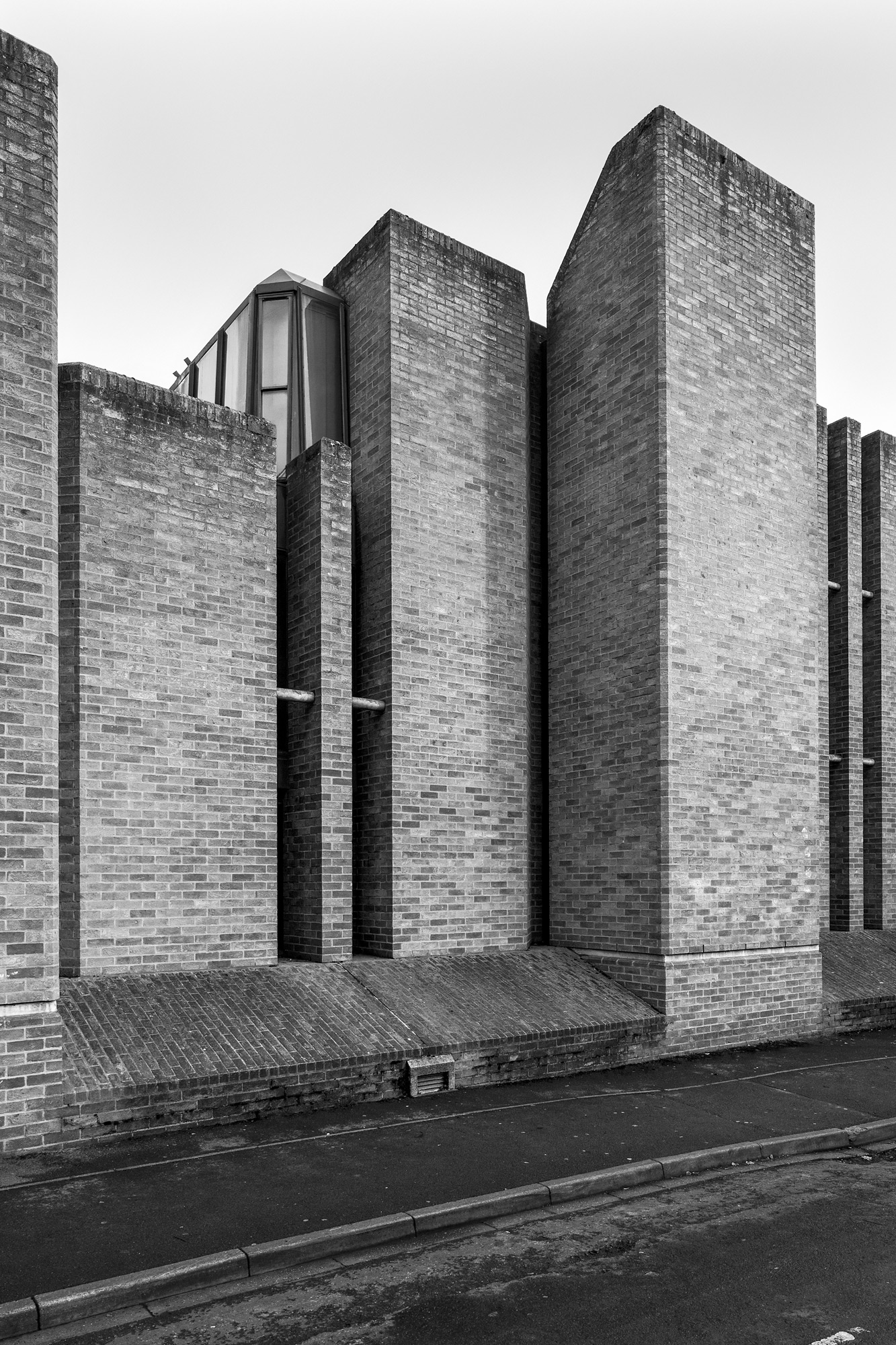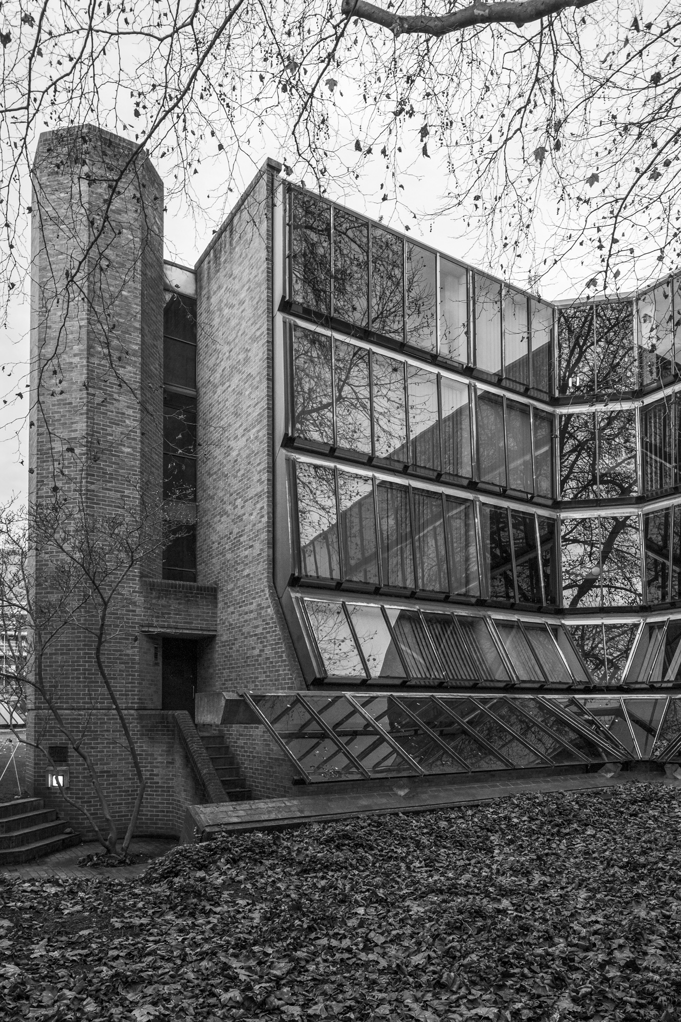 Block of 82 study bedrooms for fellows, graduates and undergraduates, with two fellows’ flats, middle common room and related facilities, a workshop and electricity transformer station. 1971-3, 1975-7 by Ahrends, Burton and Koralek, partner in charge Peter Ahrends, job architect Graham Anthony; engineers Ove Arup and Partners. Honey-coloured brick exterior to Blackhall Road, with paviours to covered walkway, blockwork inner walls, and brown acrylic-painted aluminium patent glazing with bronze tinted glass to internal quad. The plan resembles a snake which slowly uncoils down Blackhall Road, the block descending in height as it does from five storeys to one,