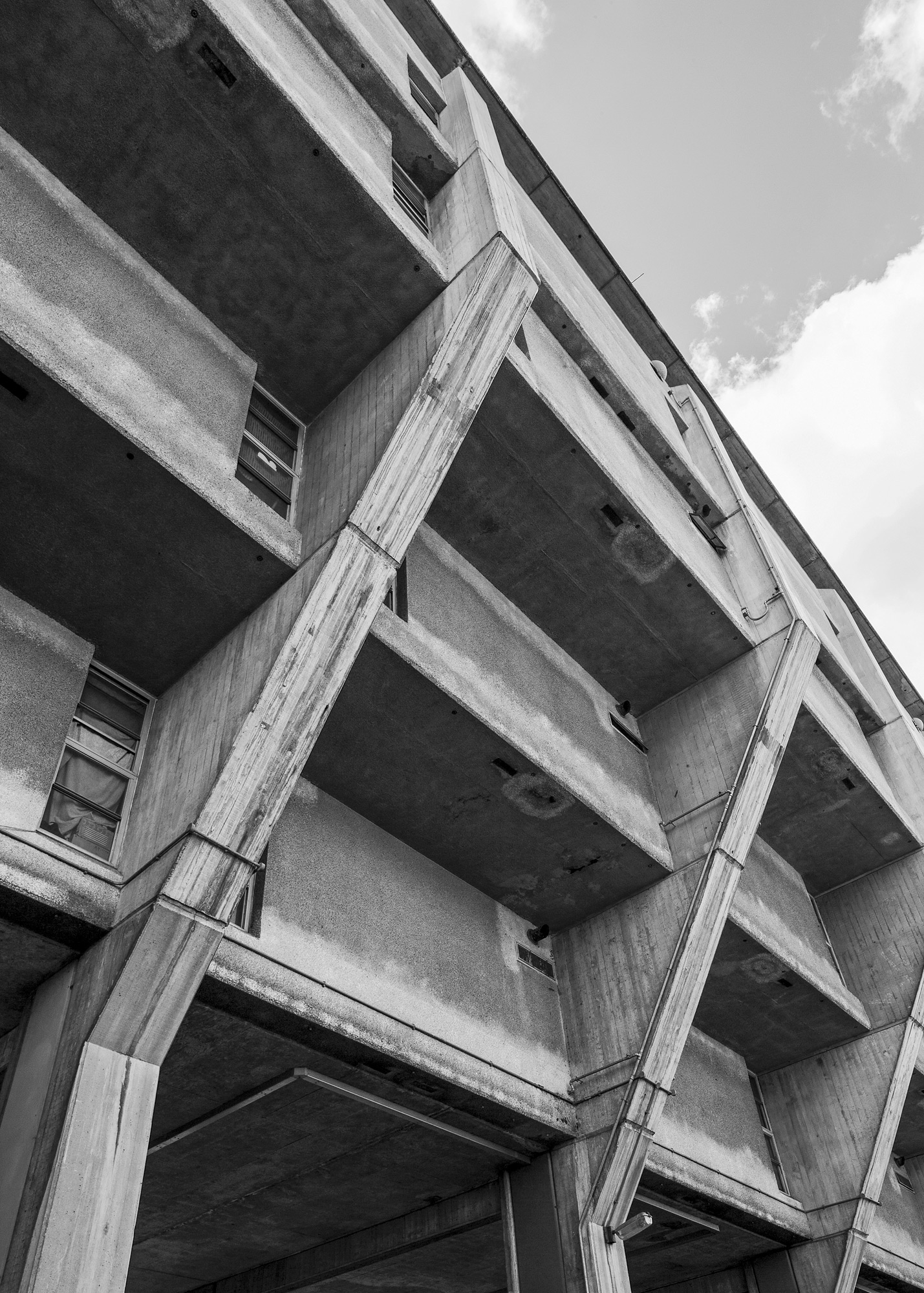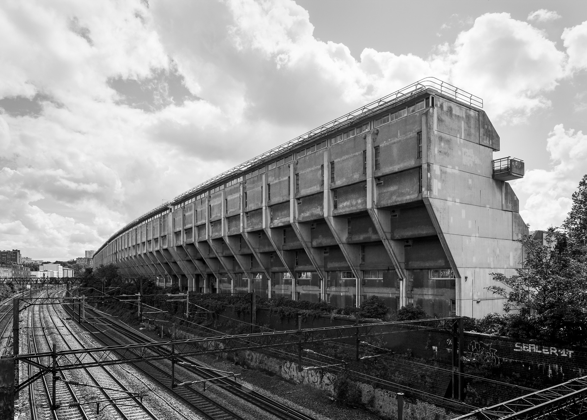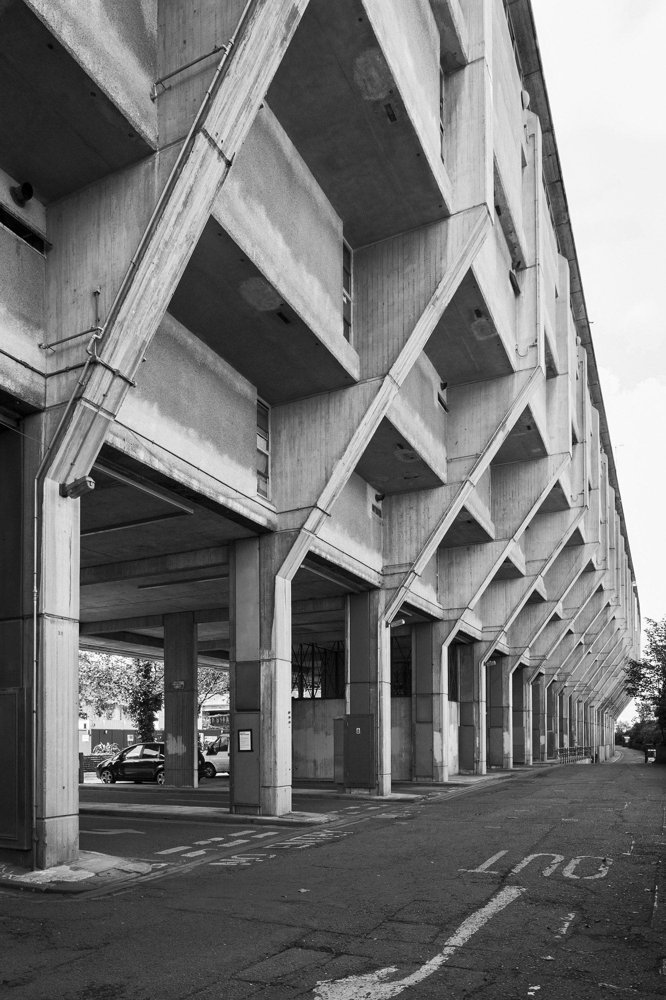The new council of Camden formed in 1965 had the necessary circumstances for creating housing of the highest quality – visionary borough architect, Sydney Cook; a pool of passionate and talented young designers; and a substantial housing budget. Camden’s enlightened policies, implemented through excellent and innovative housing resulted in an increase in social housing and an improvement in the residents’ quality of life. The Alexandra Road Estate is an extravagant and grandly ambitious comprehensive redevelopment of a 15-acre site in South Hampstead. The development comprises three parallel linear terraces of varying heights, the tallest of which is built as a ziggurat. The stepped section acts as a buffer to sound and vibration from the West Coast Mainline Railway that bounds the north of the site. Built from in-situ concrete – that is, cast on site in wooden form work – the estate is an exemplar of Camden housing and Neave Brown’s principle of low-rise high-density development in contrast to the tower blocks still commonly commissioned by many borough councils of the time. One of the last of Camden’s major housing projects, it was built on a scale that won’t be seen again.