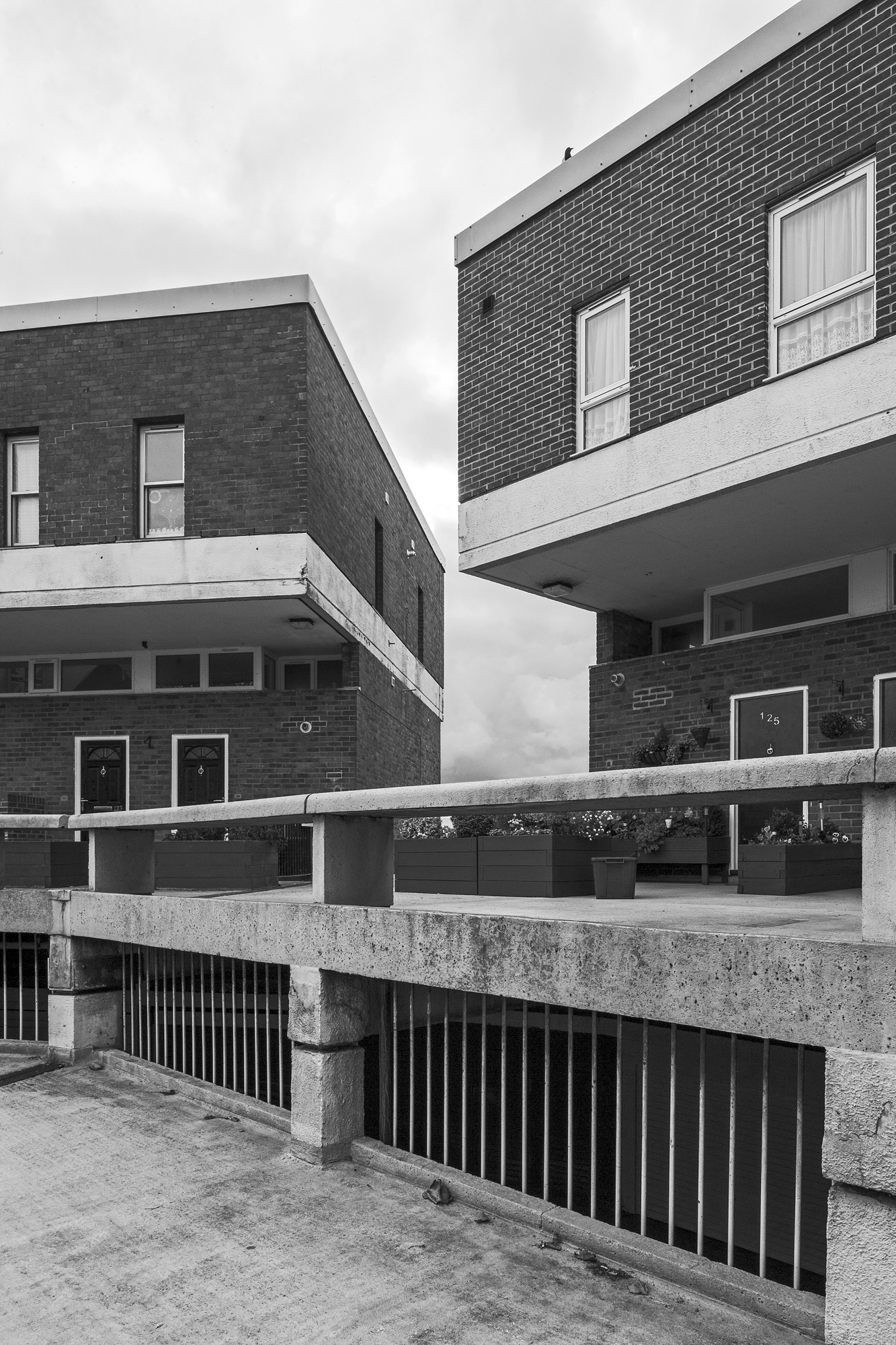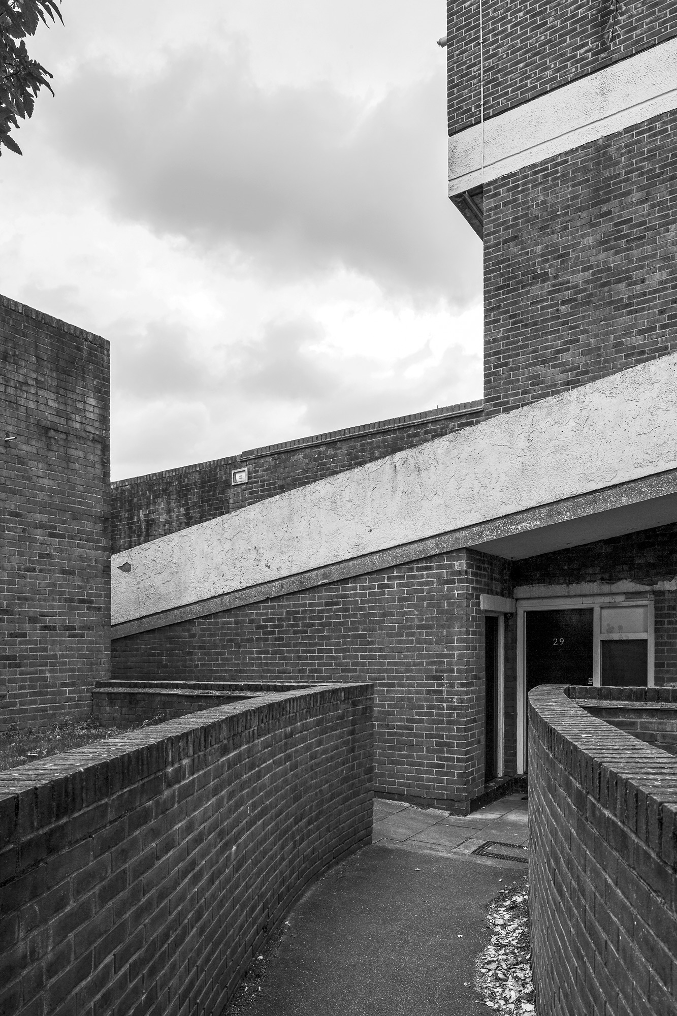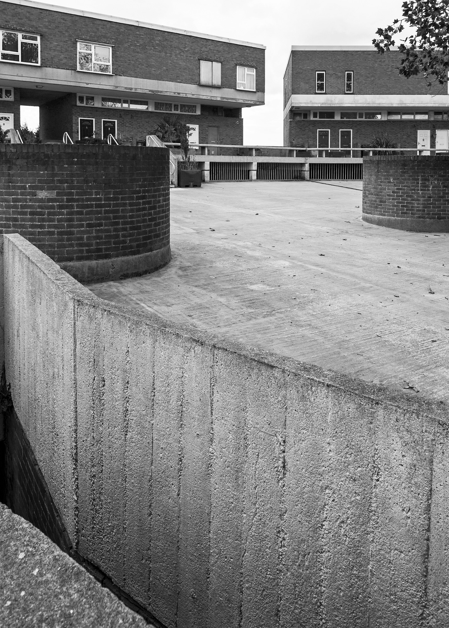 Known locally as ‘the Kasbah’, the staggered set of 256 dwellings at Bishopsfield, just south of Harlow New Town, is based on the winning design submitted to an open competition held in 1961. The brief by Harlow Development Corporation sought to give architects “a freer hand to solve the old problems in new way”. The first prize went to Michael Neylan, a 24 year old graduate working for Chamberlin Powell and Bon, who quickly recruited William Ungless as his partner—the firm went on to have a great success in social housing, notably in Southwark. The Bishopfield Estate won a Civic Trust Award in 1968 and Housing Design Award in 1969. Widely published in the architectural press, Bishopsfield’s plans informed generations of architects, planners and students in Britain and overseas.