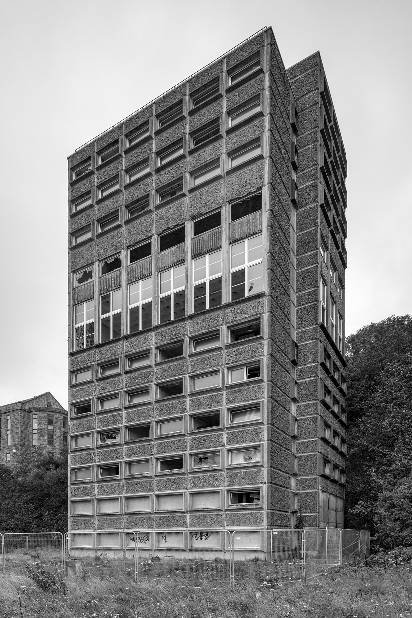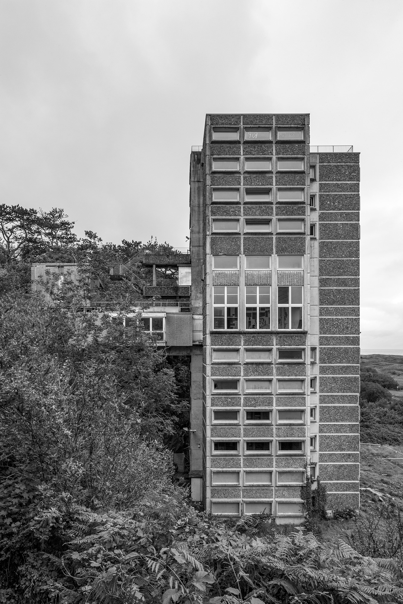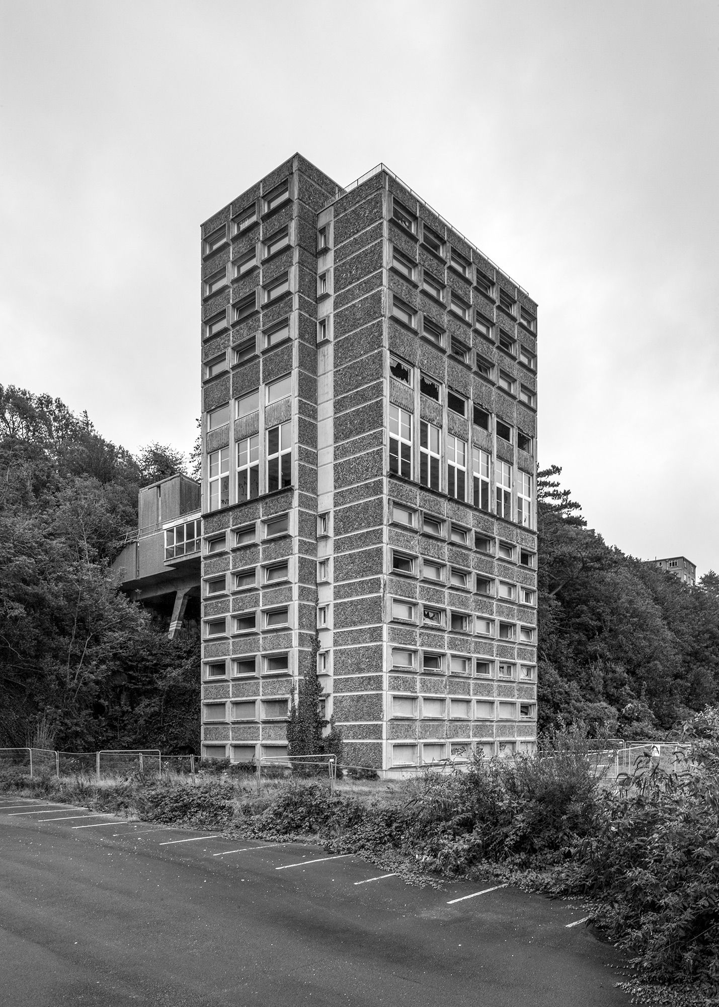 The 12 Storey Hall of Residence at Coleg Harlech designed by Colwyn Foulkes and Partners and opened in 1968 is faced with pre-cast aggregate panels and cast concrete windows. The entrance is on the fifth floor which is accessed by a footbridge from the cliffside to the rear of the building.