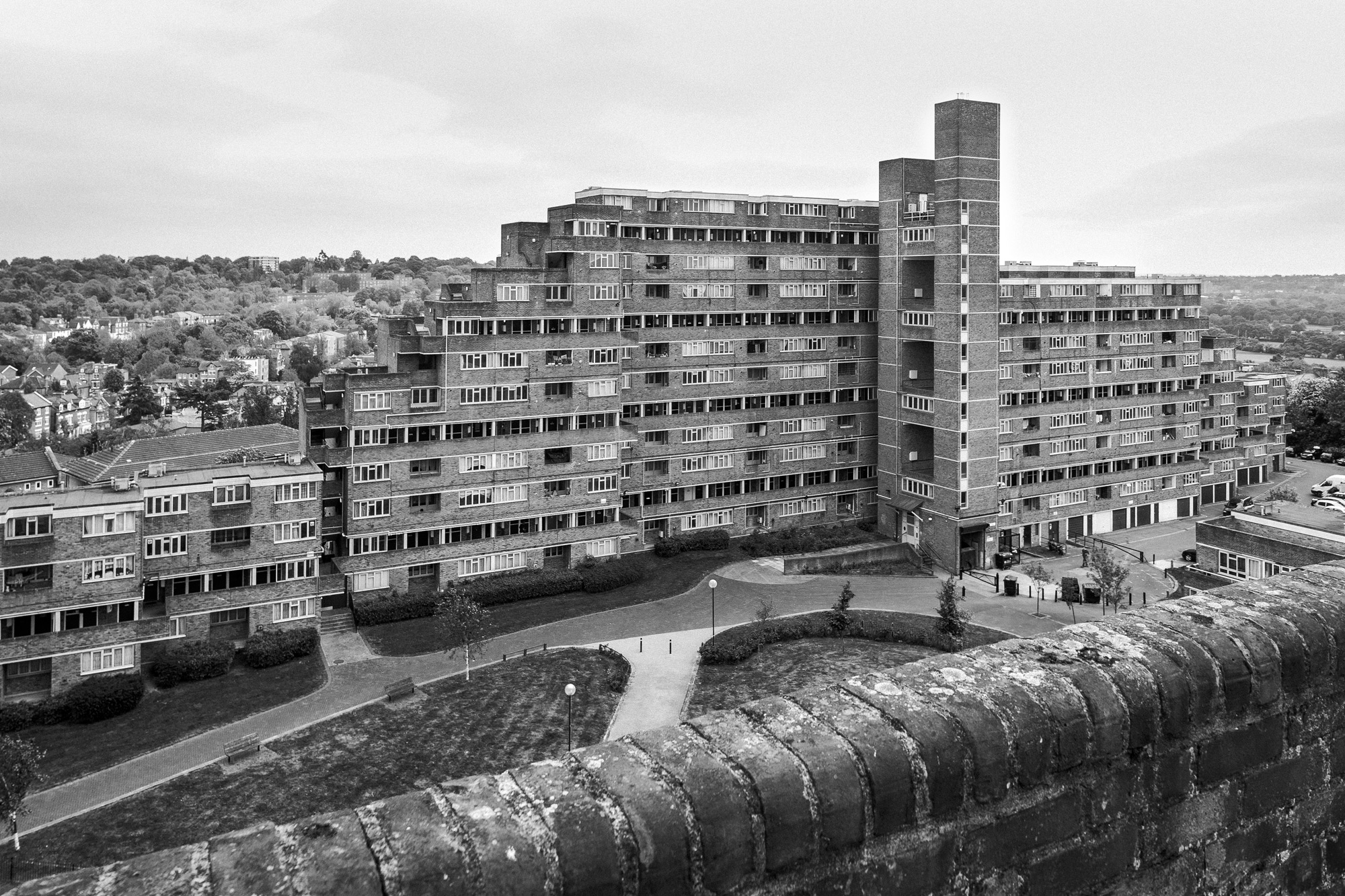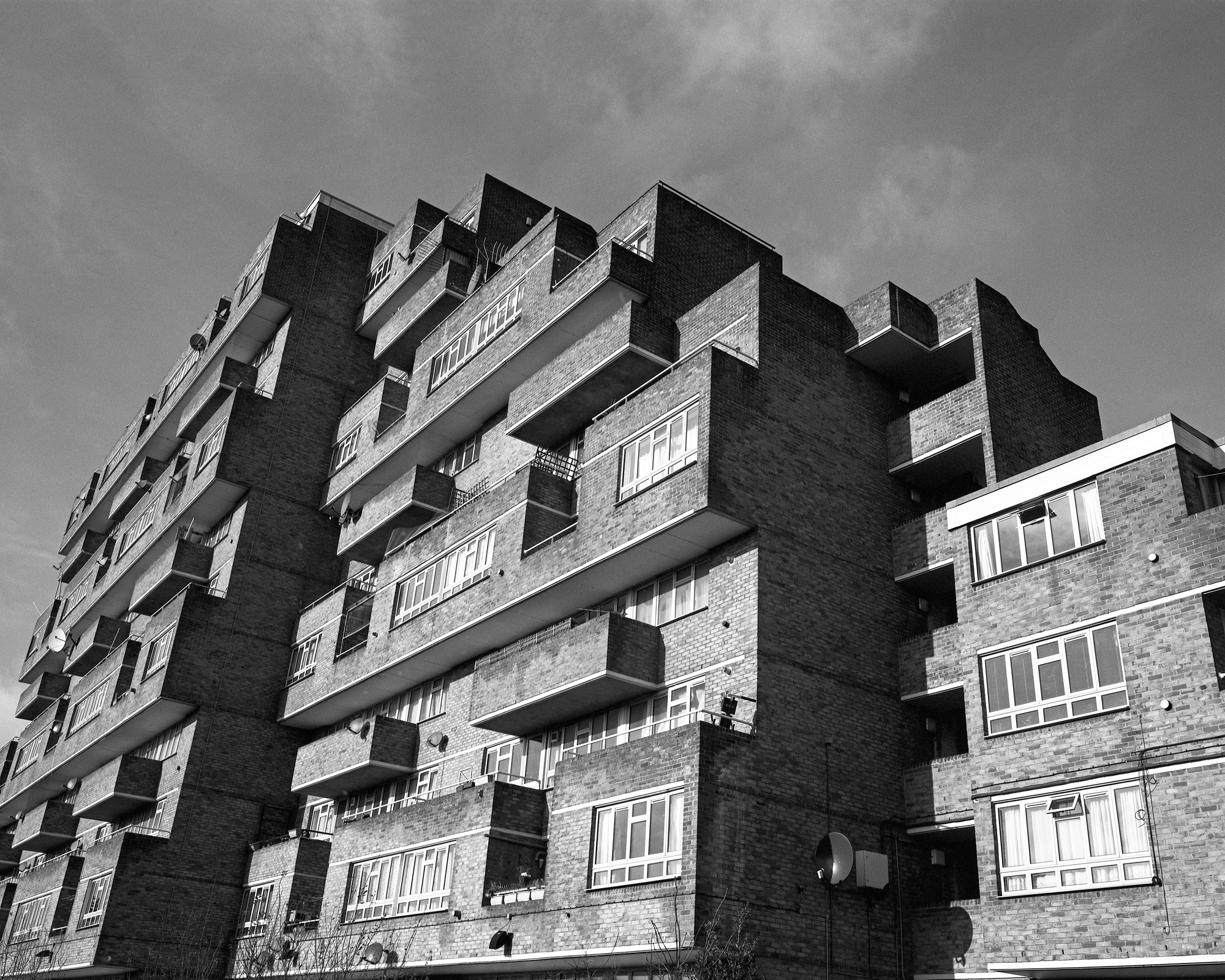 Kate Macintosh designed Dawson’s Heights when she was just 26. Built atop a monumental spoil heap left over from the construction of the railway, this visionary mega-structure’s stepped profile and audacious crystalline forms evoke a small citadel when viewed from afar. Two slabs sit astride the hill surrounding a public space of gardens, a play-area and landscaped grass, with parked cars kept out of the way to the rear of the Ladlands block. At closer quarters, the warm brick softens the monumentality of the buildings, and the generosity of space removes the fortress allusion to create a friendly place. The slabs are staggered, the varying proportions of the elements heavily modulated with balconies offering depth and relief. The balconies, which were initially rejected as an extravagance, were cleverly incorporated by designing them to operate simultaneously as fire escapes.
