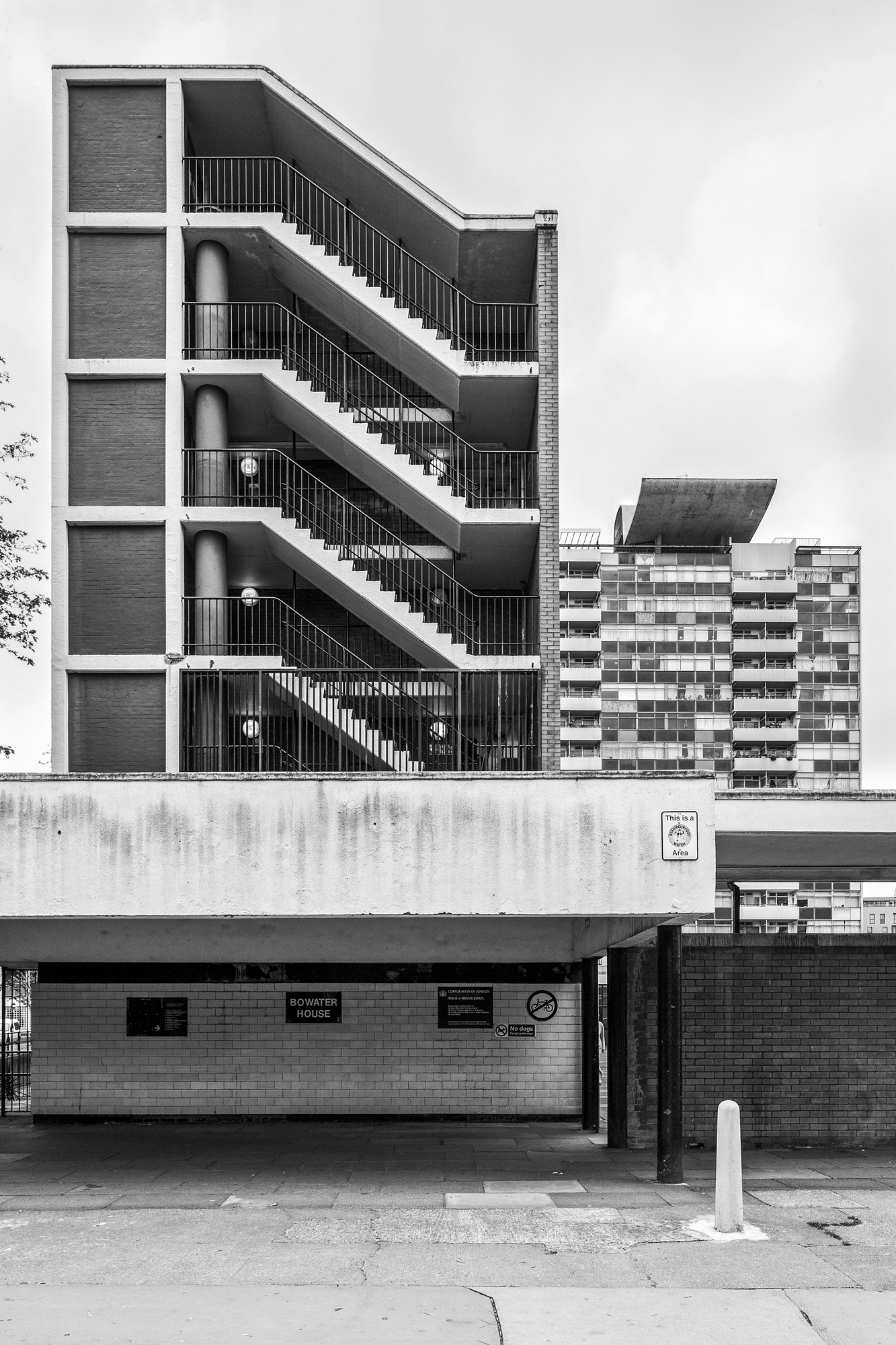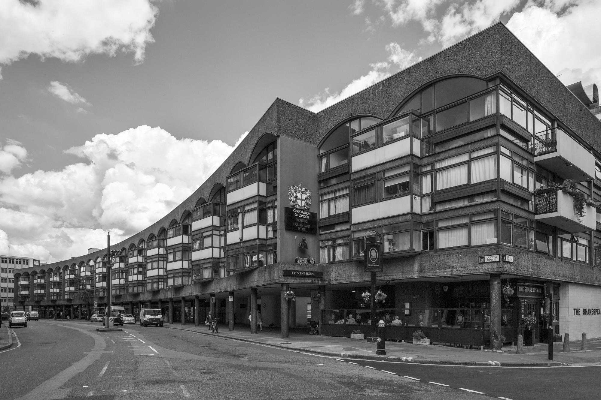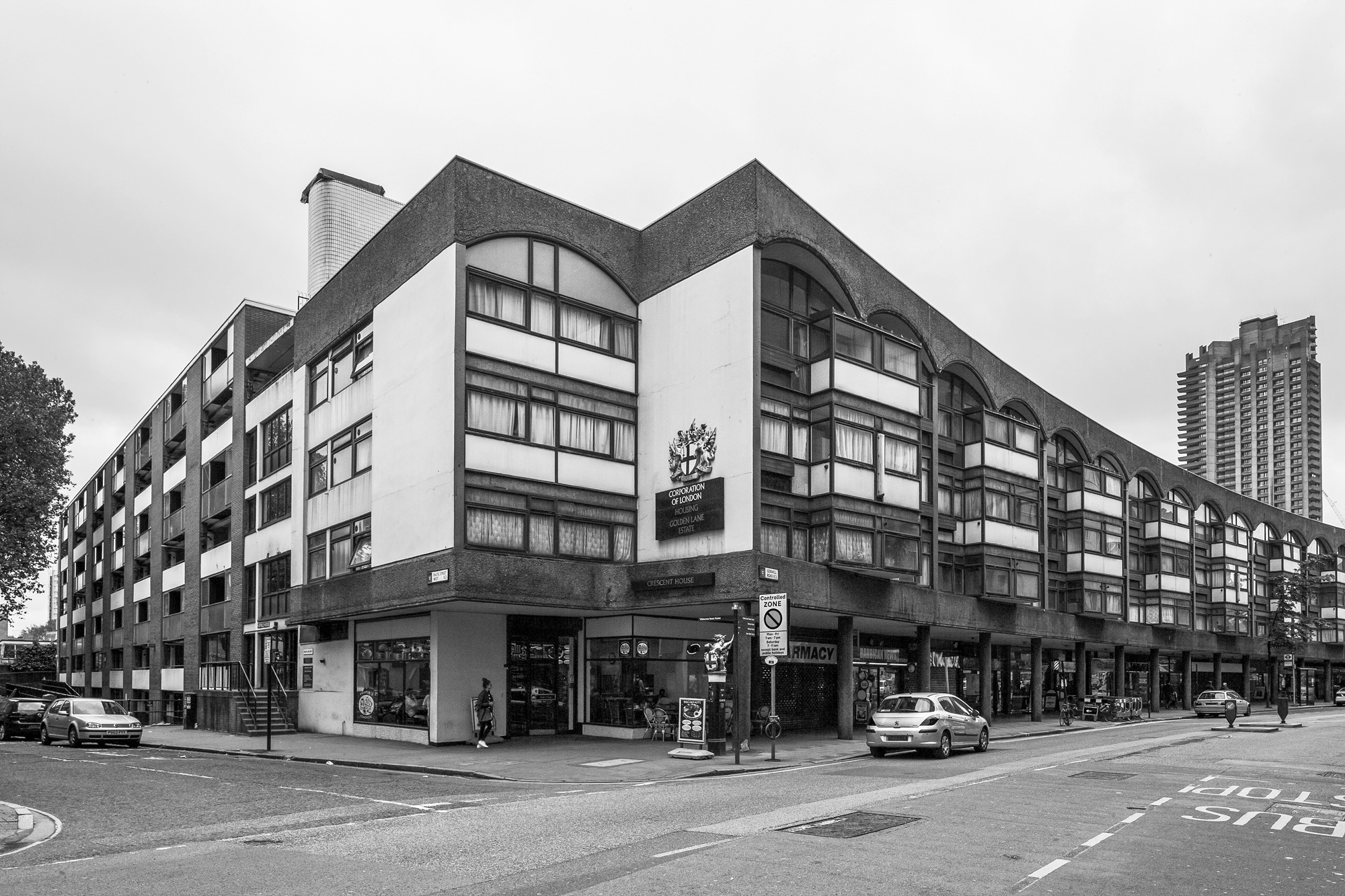 The Golden Lane Estate was built between 1952 and 1963 to the designs of the architectural practice Chamberlin, Powell and Bon. The brief was for 940 mainly small flats but this was later expanded following the purchase of additional land. As completed, the estate contained 1400 flats and maisonettes, a swimming pool and badminton court, a bowling green (now tennis courts), a nursery and playground, a community centre and club room, a row of shops and a pub; the Shakespeare. The basic layout is of a 17-storey tower of small flats; Great Arthur House, surrounded by three and six-storey mainly linear blocks of larger flats and maisonettes and communal facilities with some green spaces between. The philosophy behind it was to account for every element of space, provision of a wide range of facilities and replacement of the pre-war road pattern, making an inward-facing development around a series of courtyards.