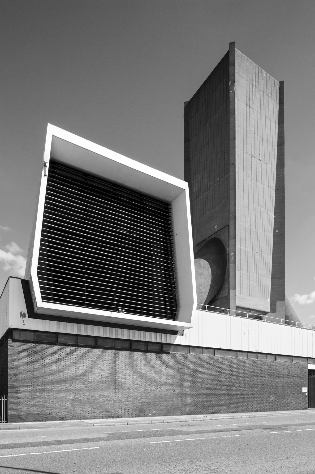 The Kingsway vents are superficially utilitarian in the clarity of their parts – the air intakes look like intakes, and the chimney looks like a chimney. As so often with the concrete architecture of the 1960s and ’70s, however, this apparently inarticulate simplicity only thinly cloaks a considerable artistic forcefulness. For a start there is an exaggerated quality to the clarity of these vents. The paired vents and bifurcating chimney flues, for example, advertise the presence below of two parallel tunnels. More, the forms themselves are heightened: the chimney swelling cartoonishly as it rises, stiffened by space-rocket-like fins and flanked by the faintly biomorphic air intakes, make these tunnel vents amongst the most immediately recognisable monuments of Liverpool, a city with no shortage of recognisable monuments. The shapes of the vents speak so persuasively of technology, of a particular vision of progress and the future, that they have frequently been compared either to space craft or to a high-design 1960s sound system.