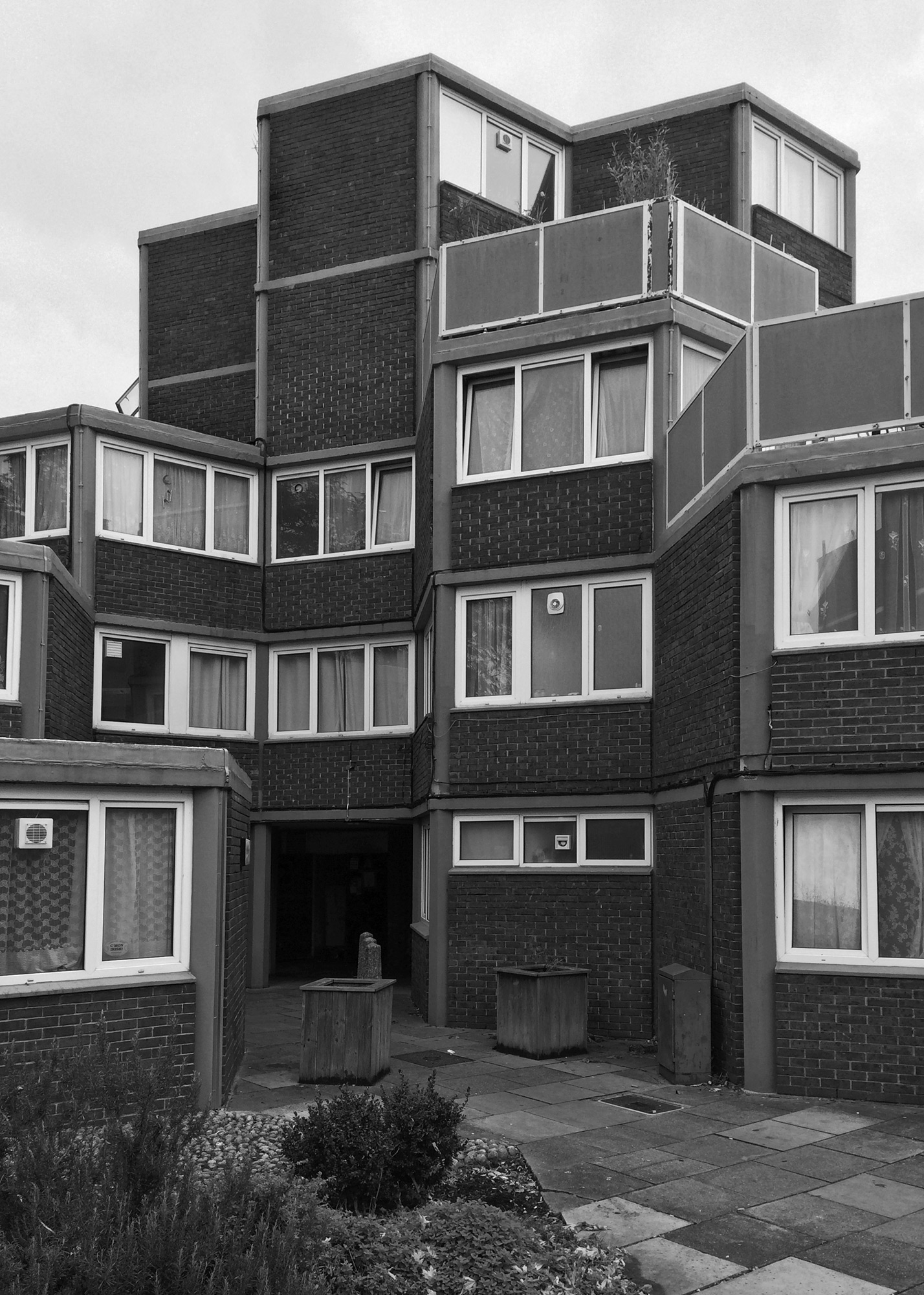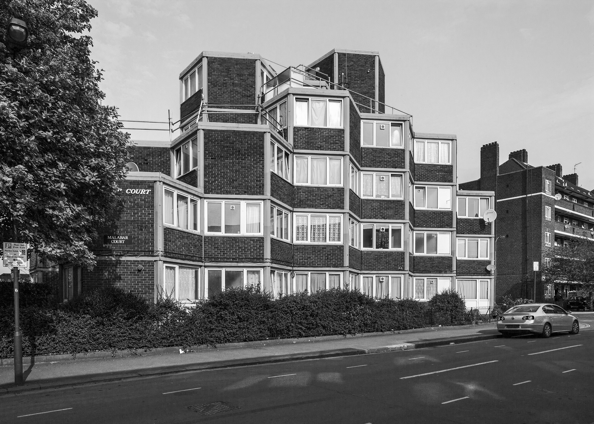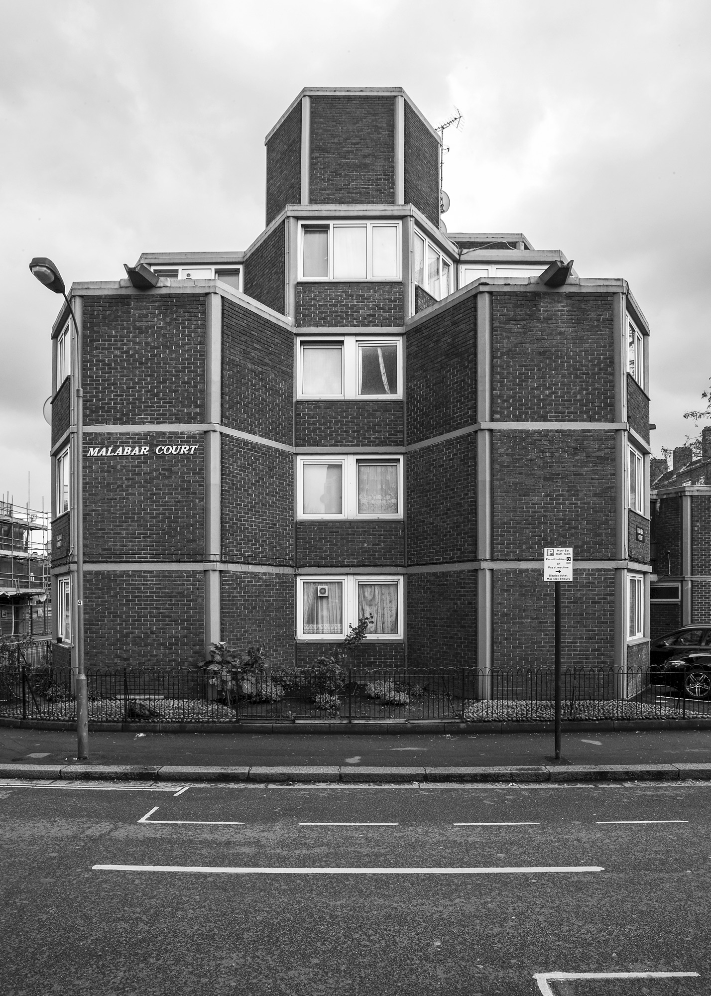 Malabar Court was designed as retirement housing, the purpose for which it is still used today. It is arranged as stacked hexagonal light grey pre-cast concrete frames around a central core. The frames are accented by the contrasting dark brown brick infill. There is something of the Giant’s Causeway in the manner in which the hexagonal units descend in staggered and stepped fashion, from five storeys to one, with great sculptural effect
