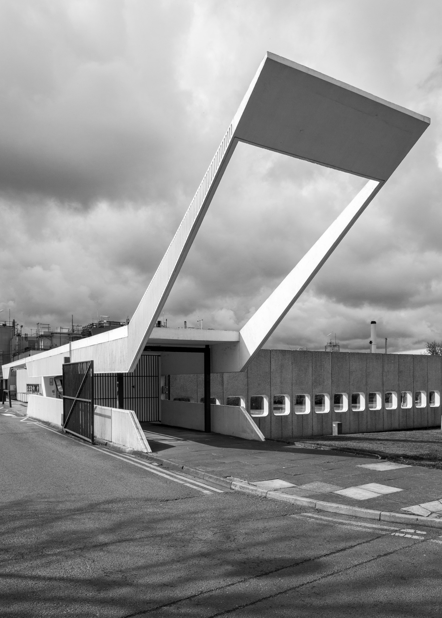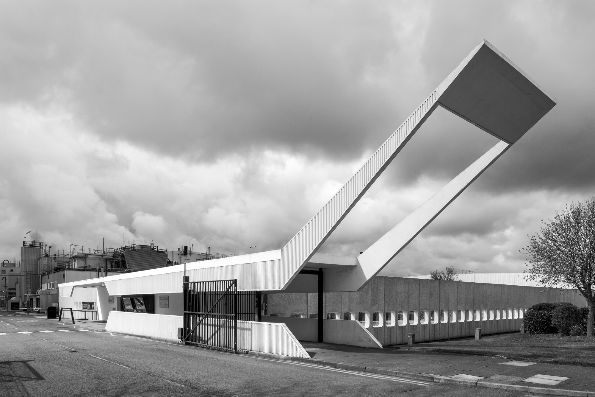 The new development for the pharmaceutical company Sterling Organics comprised of three buildings linked by covered ways. The external walls were clad in modular pre-cast concrete panels, so that different activities in the separate buildings, could be regularised by a common style of facade. The panels were identically formed using exposed white quartz aggregate, and each had a single bull’s eye window glazed directly into it, together with a vertical tear duct incised from sill to ground to allow water to run off. These fully glazed panels were extended to enclose an internal garden where expansion could occur along this wall or out from the metal clad north elevation.