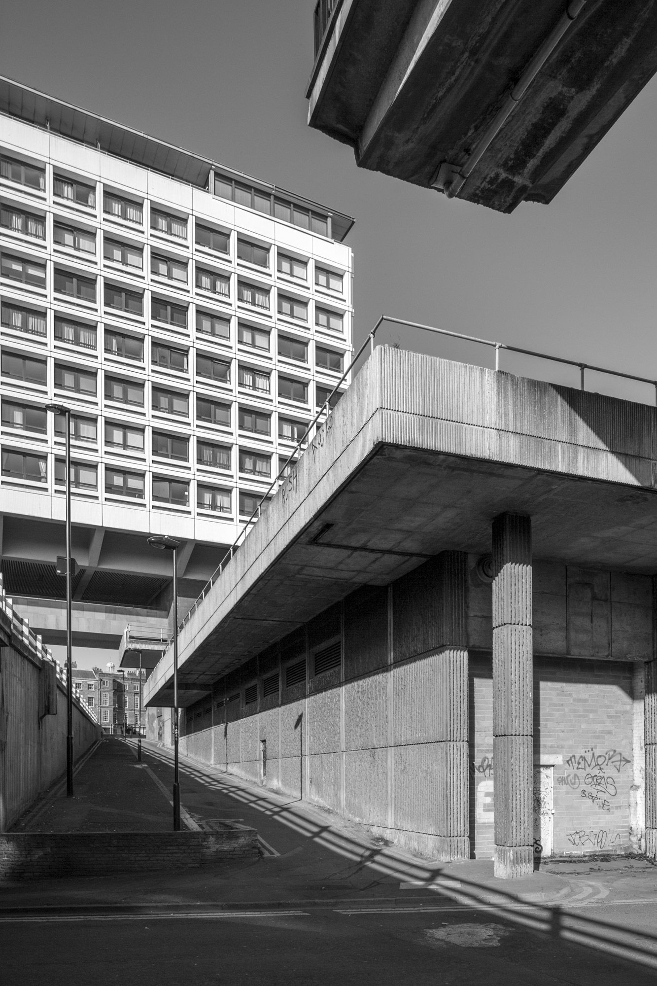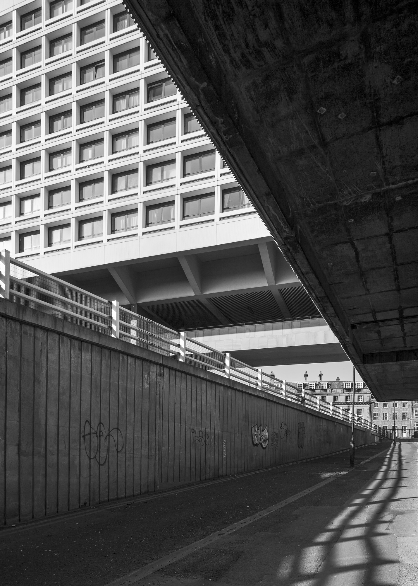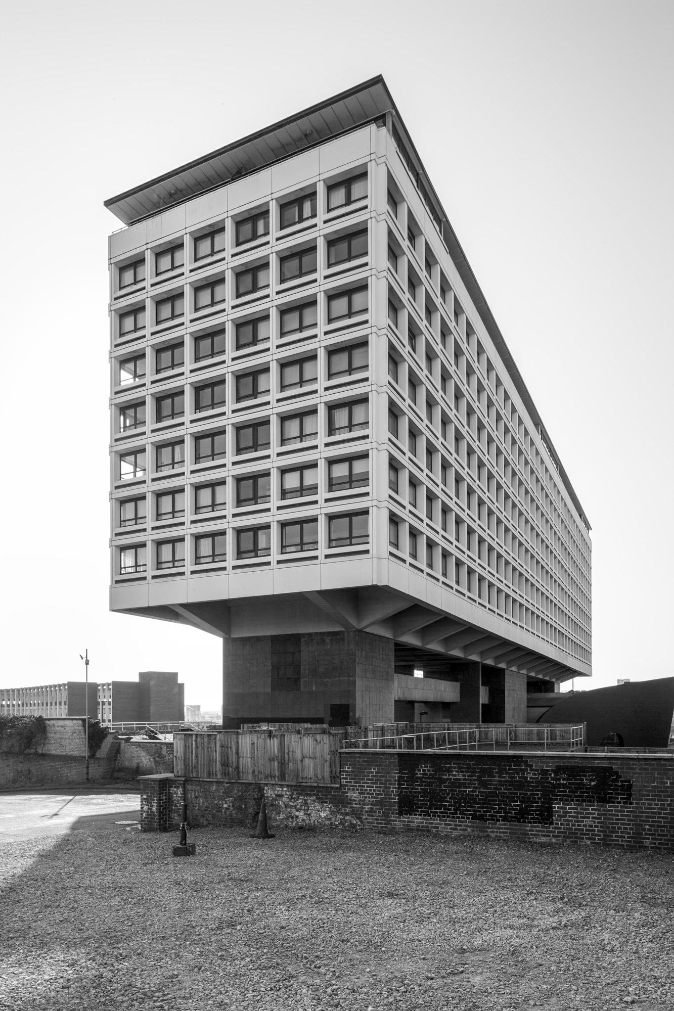 Perched on massive concrete stilts, the GPO Telecommunications headquarters would come to symbolise the ‘white heat’ of cutting edge technology at the heart of the City Planners Central Development Plan that would reshape Newcastle in mid 1960s. Set at the junction of Mosley Street and Pilgrim Street, the building is designed to cantilever over the roundabout at the first new junction of the city’s Eastern Central Motorway connecting Gateshead to the Universities, new galleries, Civic Centre, Gosforth, and the Town Moor. The tower is formed as a distinctive slab block with long concrete elevations punctured by a grid of openings. The building is cantilevered from ‘legs’ which hold the service cores and circulation, spanning out over the roundabout and roadway.