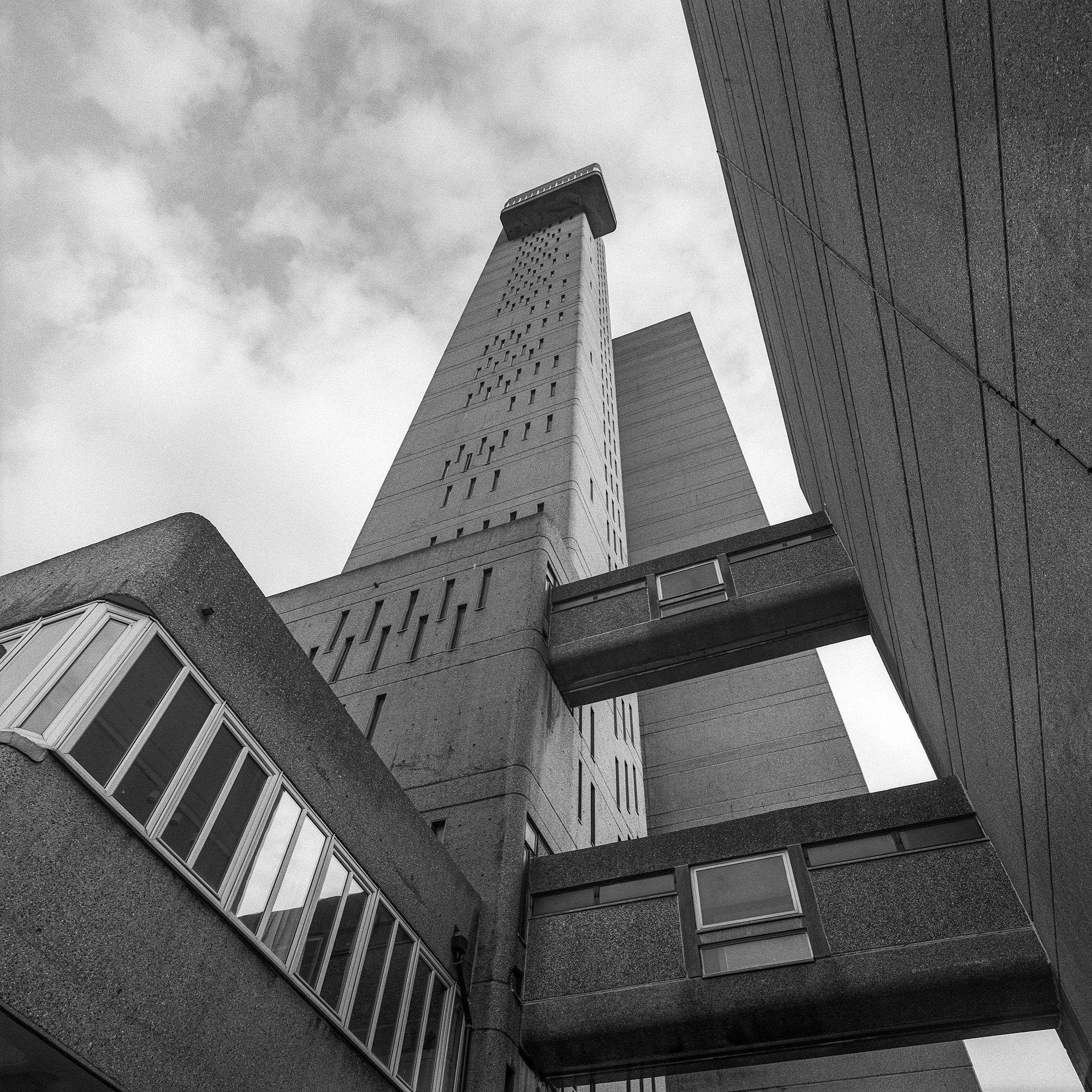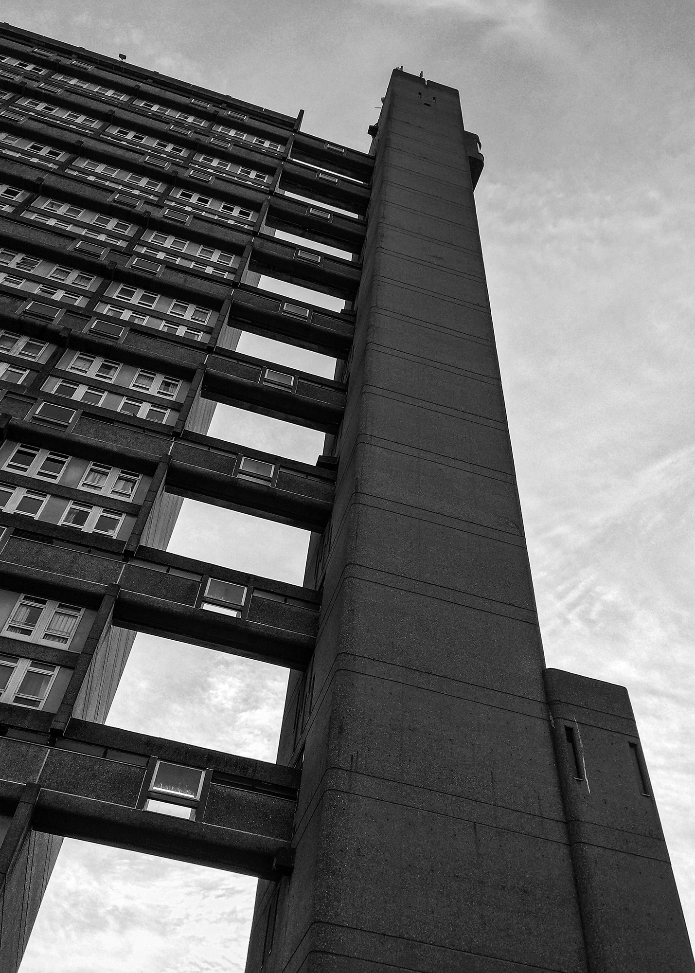 Standing at 31 storeys, with a 35-storey service tower, Trellick Tower is the standout image of a Brutalist archetype. Situated within the otherwise low-rise Cheltenham Estate, the tower is a continuation of Goldfinger’s experiments in deck access, which he first developed at Balfron Tower in Poplar (see Tower Hamlets). The plan incorporated his famous ‘streets in the sky’ where walkways allowed inhabitants access to their own front doors. Following Le Corbusier’s principle of Unité d’Habitation, access corridors serve every three floors. Unlike the Unité, the corridors are on the outside, linked by enclosed sky bridges to the separate lift tower. The strongly articulated and meticulously finished raw concrete frame has the unique hardness and uncompromising materiality that characterises Goldfinger’s buildings. Deep shadows created by the recesses and projections of the expressed architecture move hypnotically across the south elevation, modulated by sun and cloud. Soon after completion in the early 1970s, lack of management and maintenance, a concomitant rise in grossly antisocial behaviour, and a more general antagonism toward high-rise living led to years of neglect and antipathy. Trellick’s reputation plummeted, tabloids dubbed it the ‘tower of terror’, and it became a possible inspiration for the alienating and dehumanising concrete architecture of JG Ballard’s dystopian High Rise. Thankfully, those times have passed and Trellick Tower is now recognised as a masterpiece of Brutalist architecture.