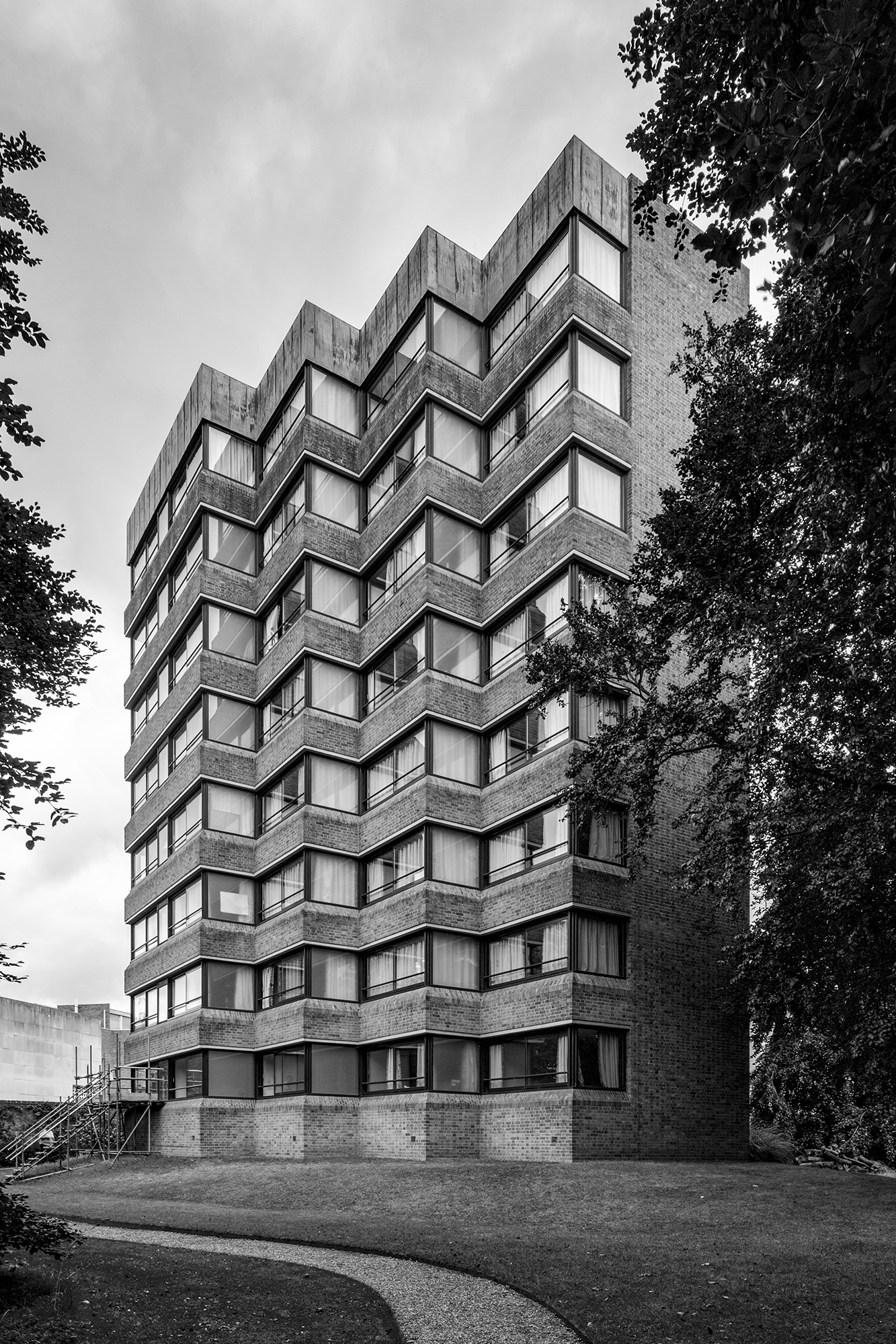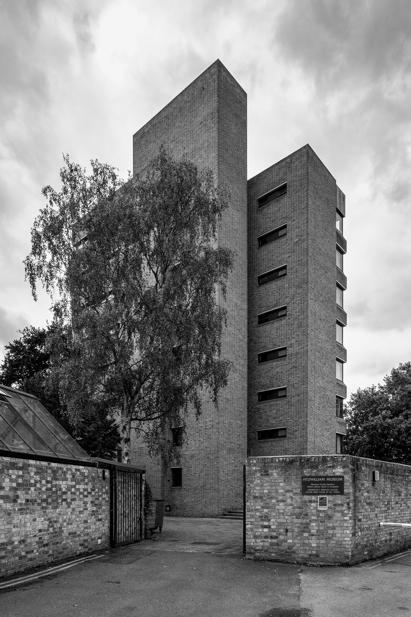 William Stone Building, Peterhouse College, Cambridge. Residential building. 1963-64. Sir Leslie Martin and Colin St John Wilson. Buff brick; copper cladding. Flat roof. Irregular plan with staggered rooms, facing west. Eight storeys. Horizontal strip windows with bull-nosed cills. Varnished timber frames. Copper sheet cladding above top storey window. Elevation to east has expressed rectangular staircase and lift tower rising above roof line and narrow horizontal strip windows. Nicholas Taylor, Cambridge New Architecture.