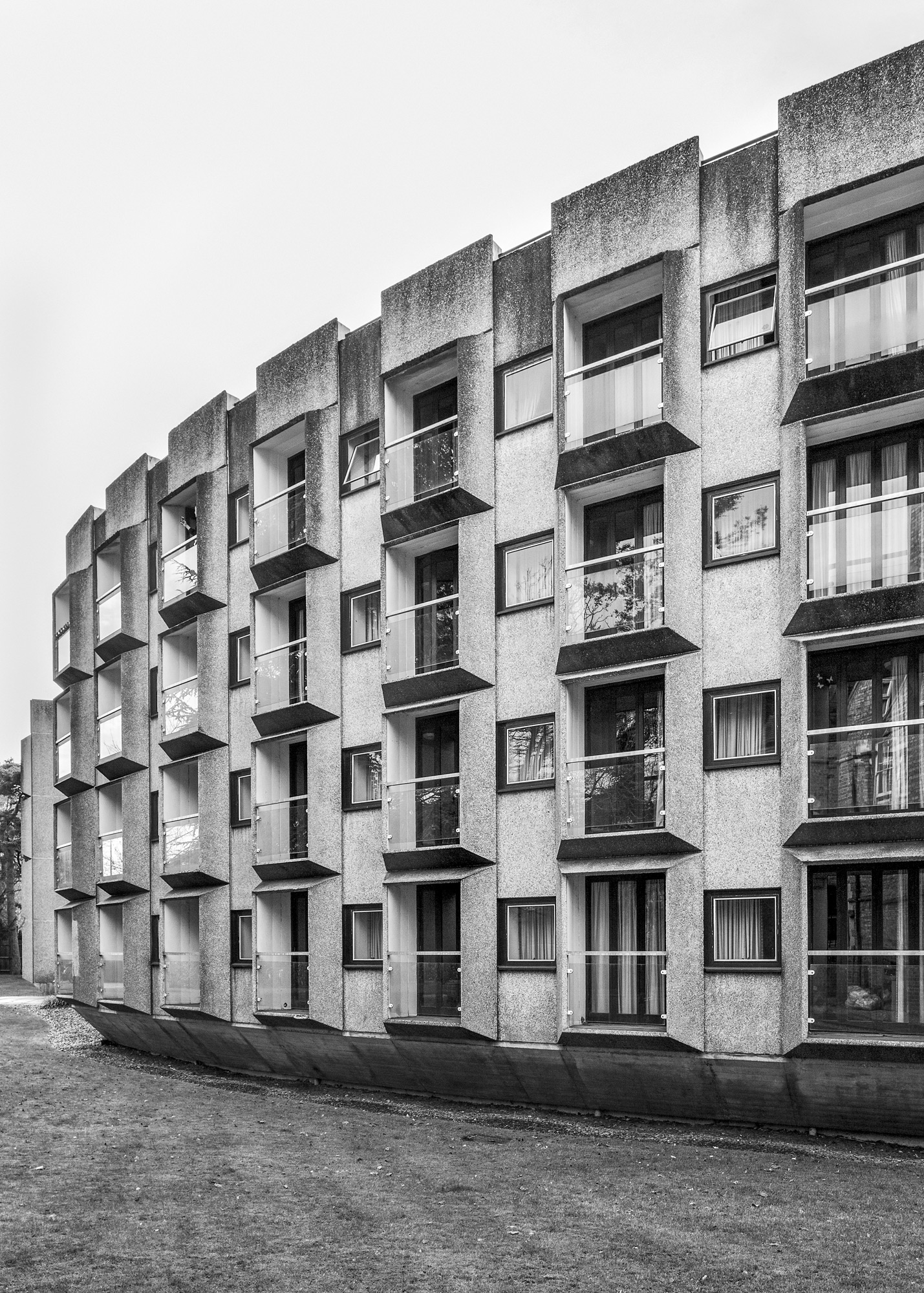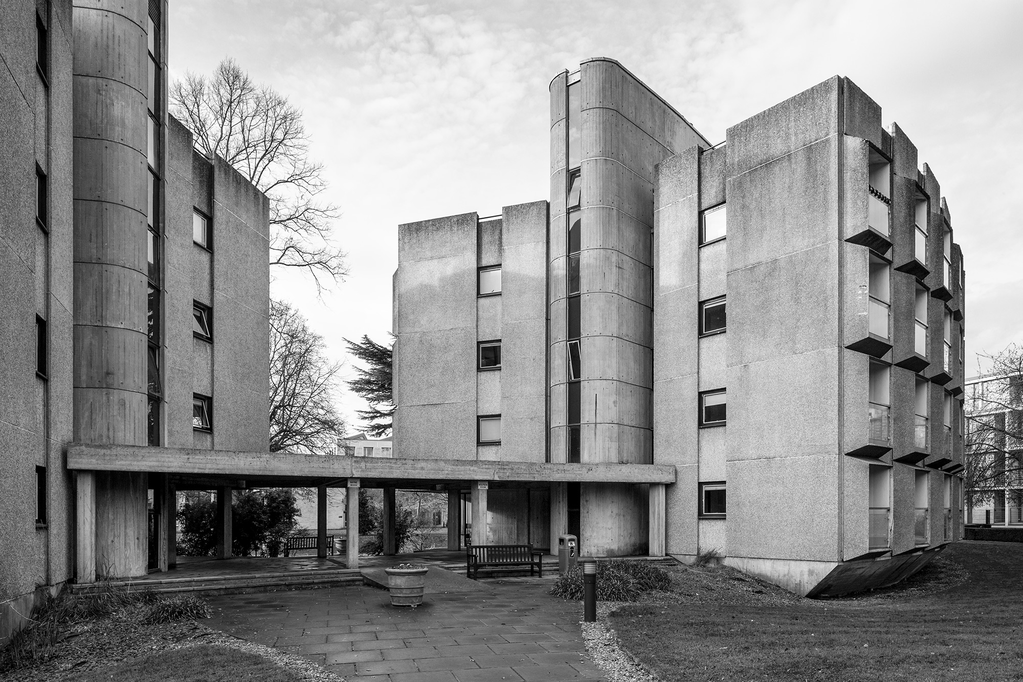 The Wolfson and Rayne Buildings at St Anne’s College are two linked blocks of college rooms. 1960-1969. Howell, Killick, Partridge and Amis. Precast concrete and board- marked site cast concrete. Flat roofs. Each of 4 storeys, with convex sides swelling around central circular staircase. Alternate bays of elevations have canted out balconies, with glass fronts and full-height windows recessed behind; between these are flush square headed smaller windows. Ground floors towards main college quad partly comprise strip windows and are partly open. Single storey open walkway link with concrete roof.